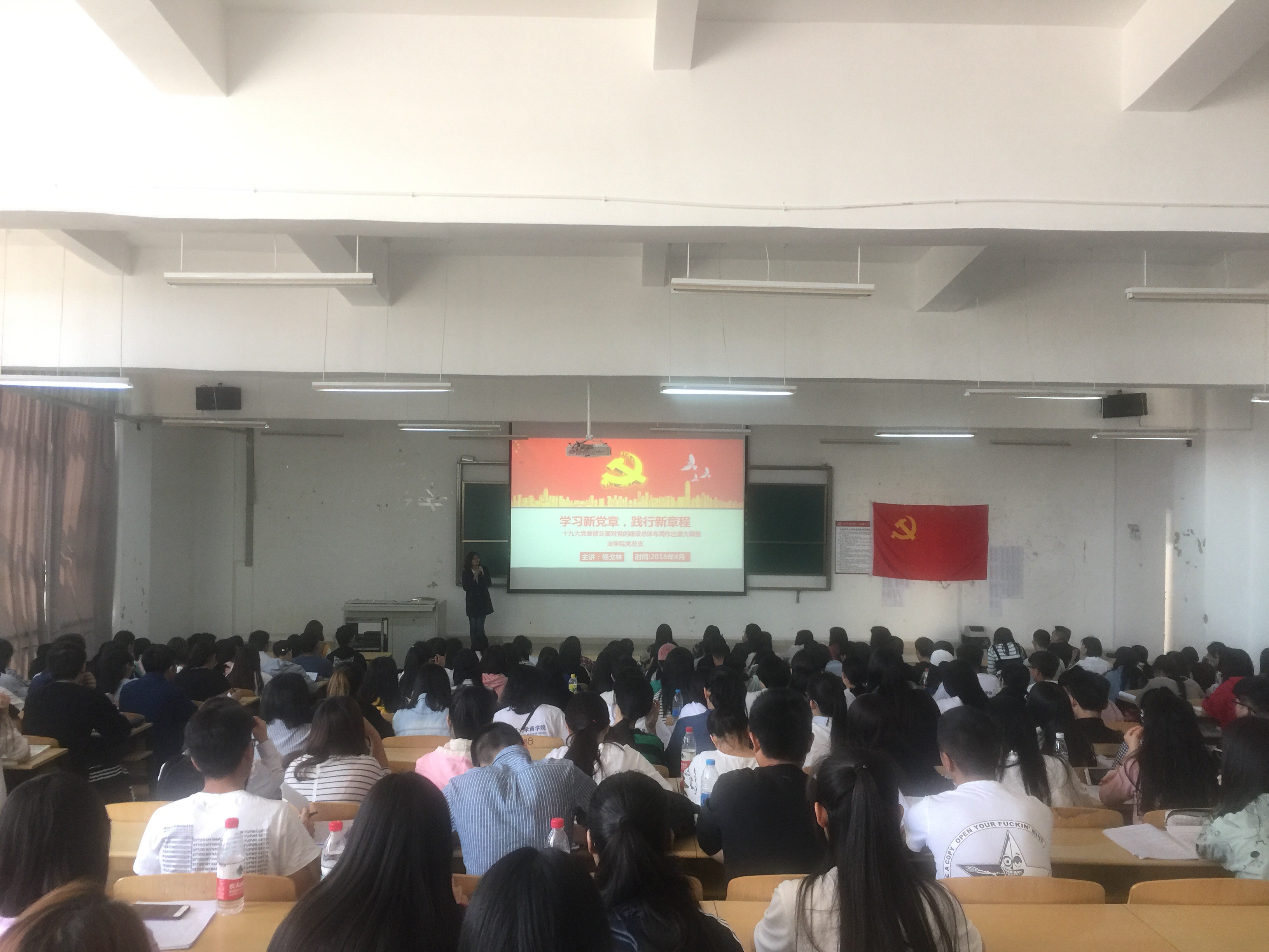 为更好的了解学习践行新党章,2018年4月14日上午11时30分,法学院党总支委员、第二党支部书记杨戈林在文心楼202教室召开了以“学习新党章,践行新章程”为主题的讲座。2017级全体入党积极分子参加了此次讲座。讲座中,杨戈林老师强调要“学习践行新党章,争做优秀党员”,围绕着新党章修改内容及如何落实新党章两个方面作出了精彩的讲解,阐述了习近平新时代中国特色社会主义思想,系统讲解了党风建设与党的纪律、现阶段我国社会主义主要矛盾及习近平强军思想。最后,杨戈林老师特别强调了在场的入党积极分子作为先锋领头人更要认真学习新党章,践行新章程,不断提高党性修养,坚持四个自信,为建设社会主义强国贡献自己的一份力量。此次讲座充分调动了2017级全体入党积极分子学习践行新党章的积极性,使大家受益匪浅。