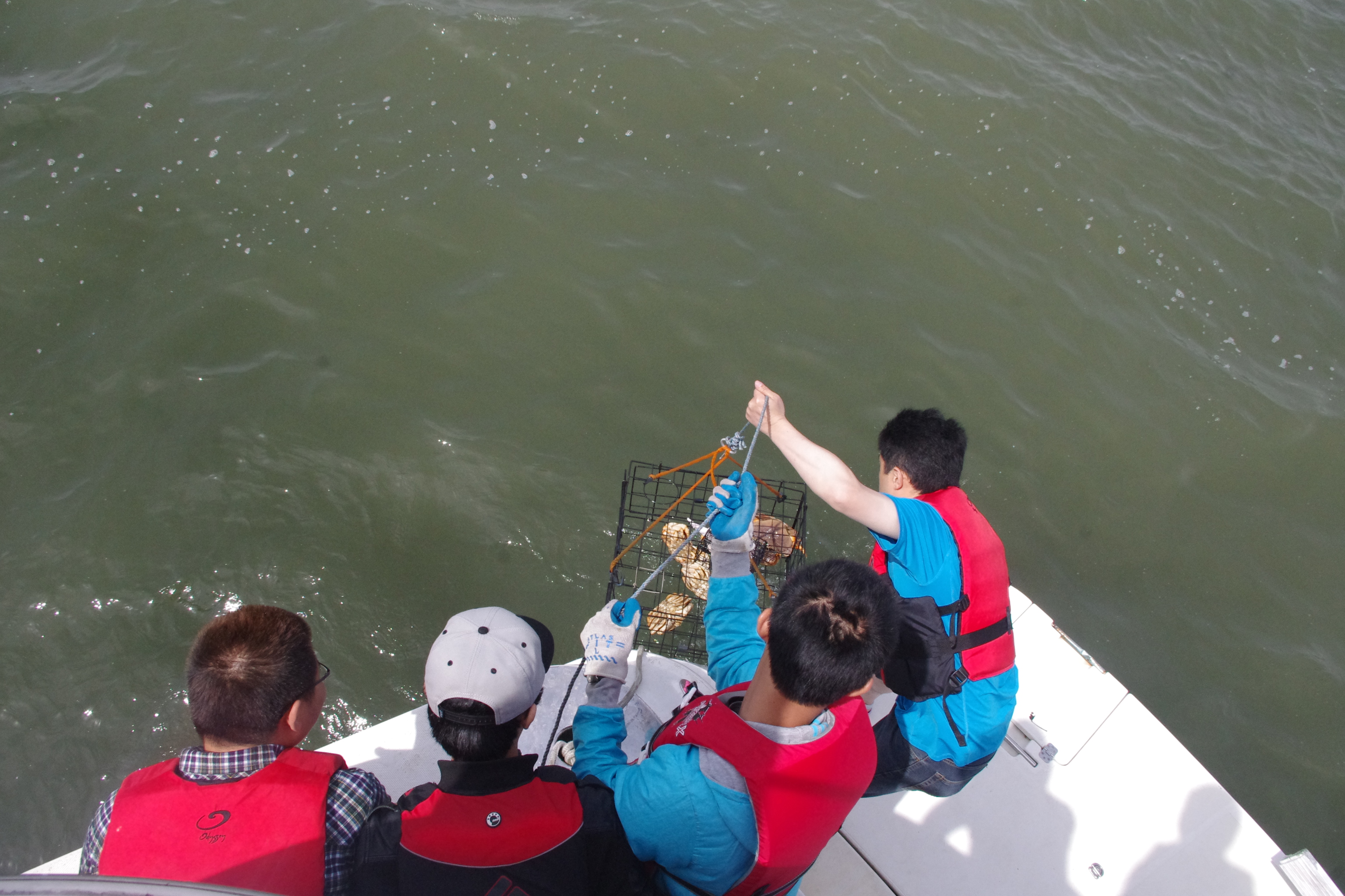 上午九点钟,远方的地平线,蓝色的海水,让我对大海有了很大的期待和向往。今天是我生平第一次出海,真正去体验打渔生活,只不过我们“打”的是螃蟹。起初我并不是很有信心,因为之前导师Gloria给我们说的是钓螃蟹,我想这钓螃蟹和钓鱼其实并没有什么两样,所以迟迟未参与其中。而在船上敖教授给我讲解捕捞的技巧时我才知道实际上是用铁笼放上肉来进行捕捞的。大家忙活了一阵,把八个铁笼布置完毕,每个小组负责两个铁笼的放和收,然后就进了船舱开始享用午餐,等着两三个小时后来收笼。