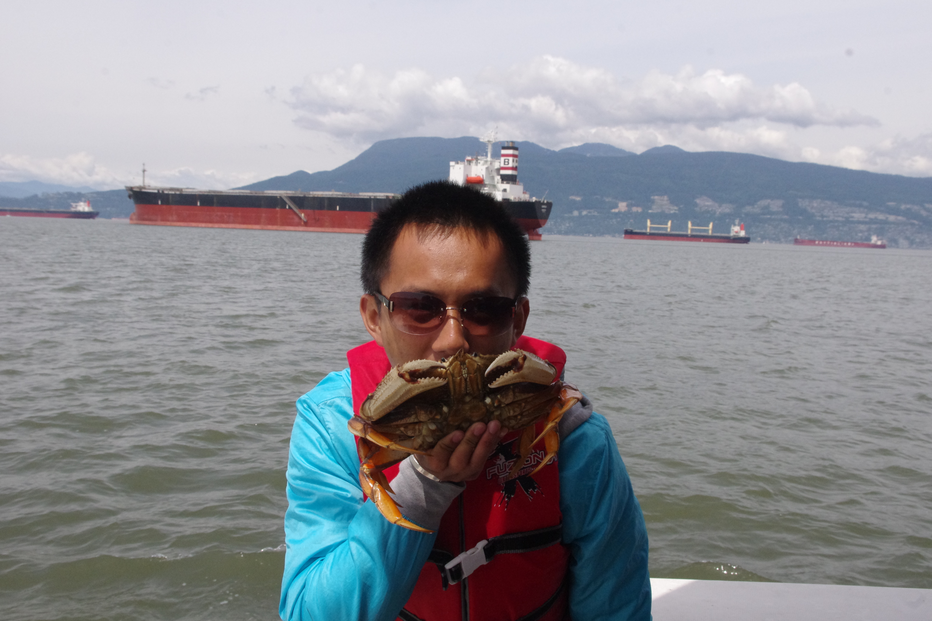 当钩子钩到笼子时,我就往上拉,这个笼子很沉啊,拉上来很费劲,当时我心中暗自惊喜,莫非有大收获吗,结果笼子浮出水面时,七八只硕大的温哥华螃蟹显现在眼前,顿感惊讶与激动!果真,收获的感觉都是那么的好。后来的几笼收获都很不错,我算是满足了。收笼的同时,船舱里不尽传来一阵阵香味,螃蟹熟了,大家又都聚在船舱享用由敖教授亲自烹饪的大螃蟹!收获的幸福感已让我回味无穷,螃蟹的鲜美更是让我意犹未尽。